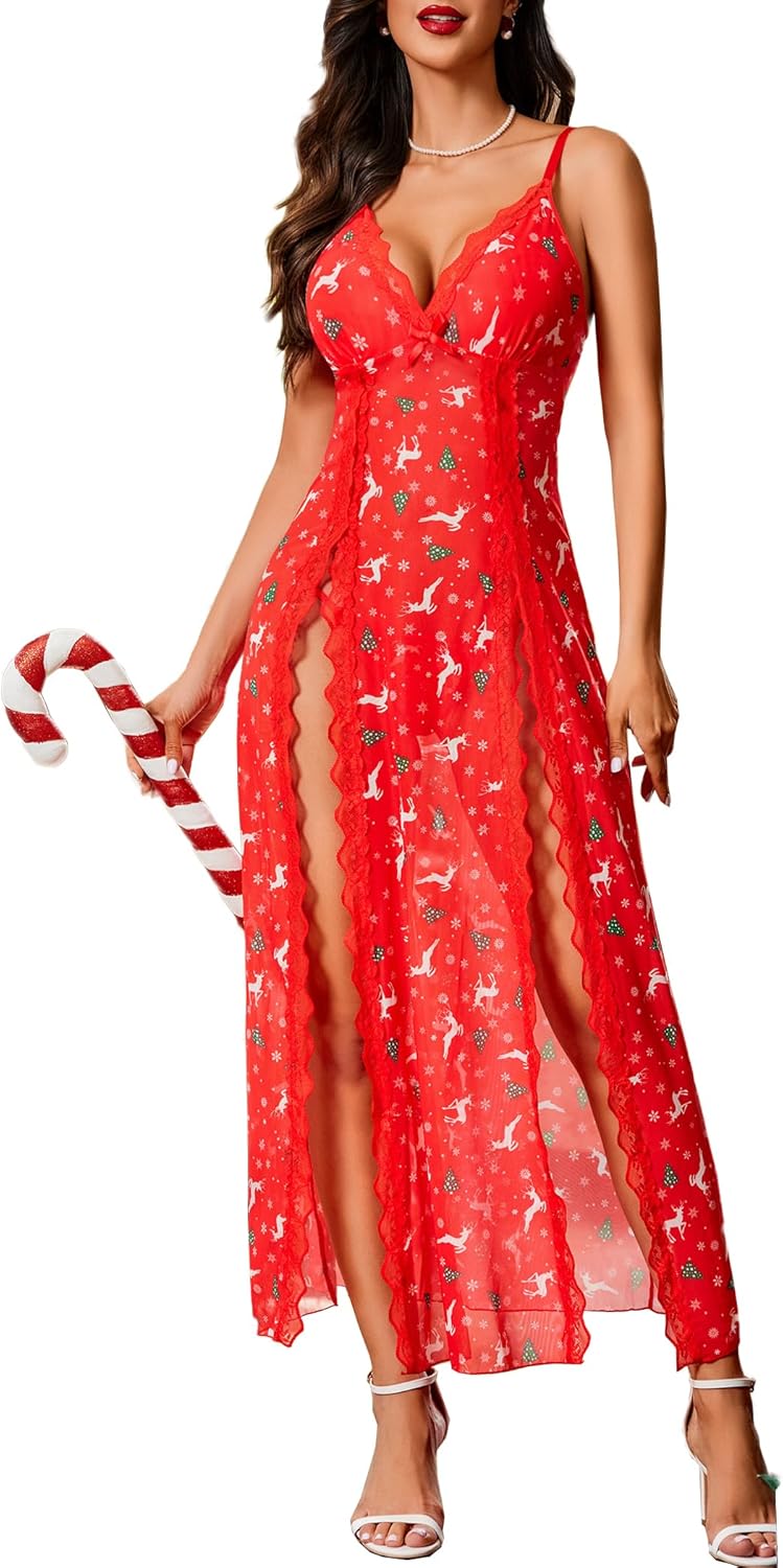 Avidlove Women Lingerie Lace Babydoll Chemise Sexy Mesh Nightdress V Neck Nightwear Side Split Nightgown