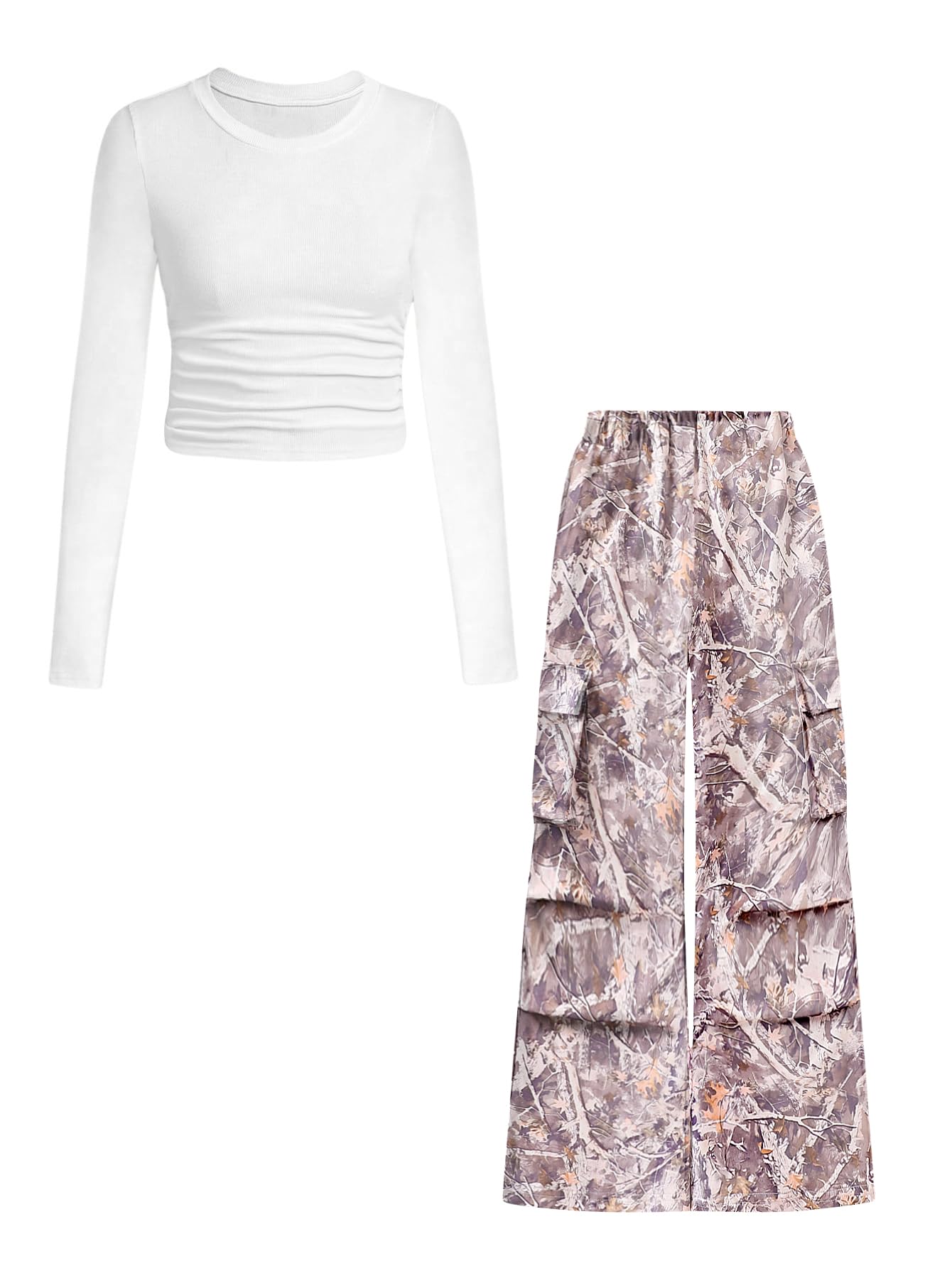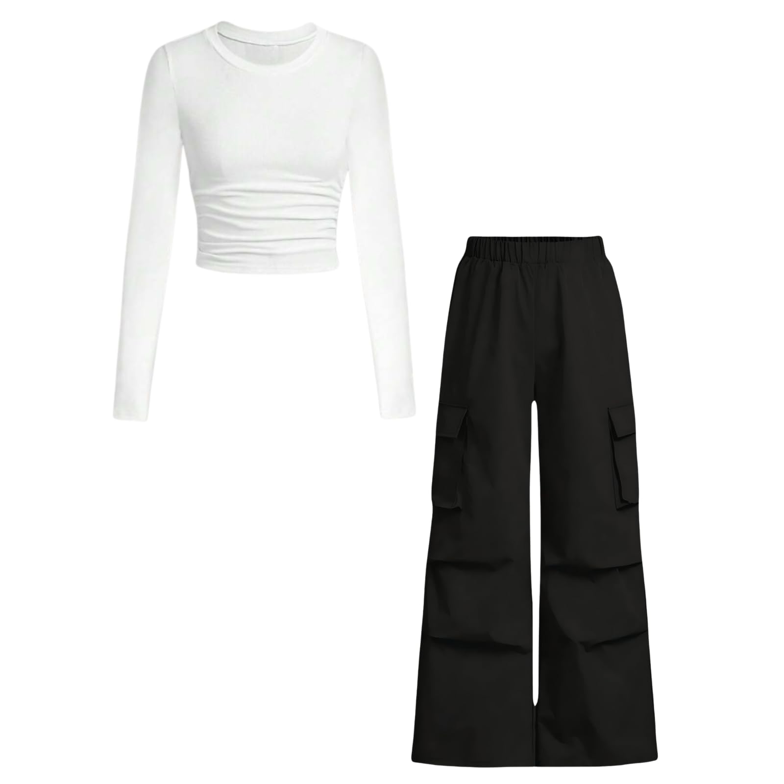 Azmxynol Girls Clothes 2 Piece Outfit Ribbed T-Shirt Top + Cargo Pants, Girls Fall Clothing Set, Sizes 5-16 Years