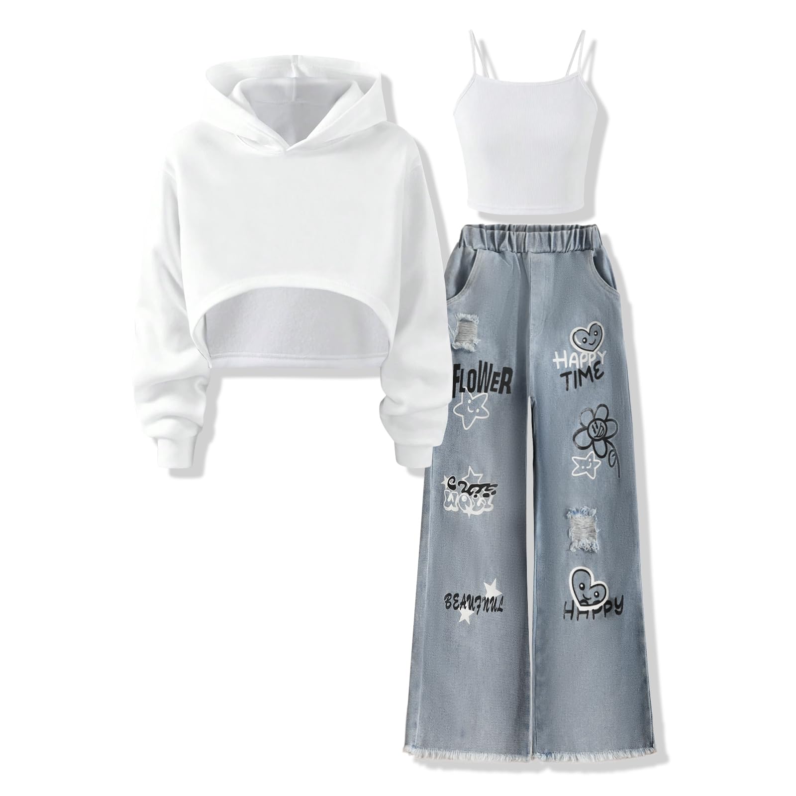 Voxikidio Size 5-10 Years Girls 3PCS Fashion Outfits Set - Cropped Hoodie + Cami Top + Printed Jeans 3-Piece Set-10